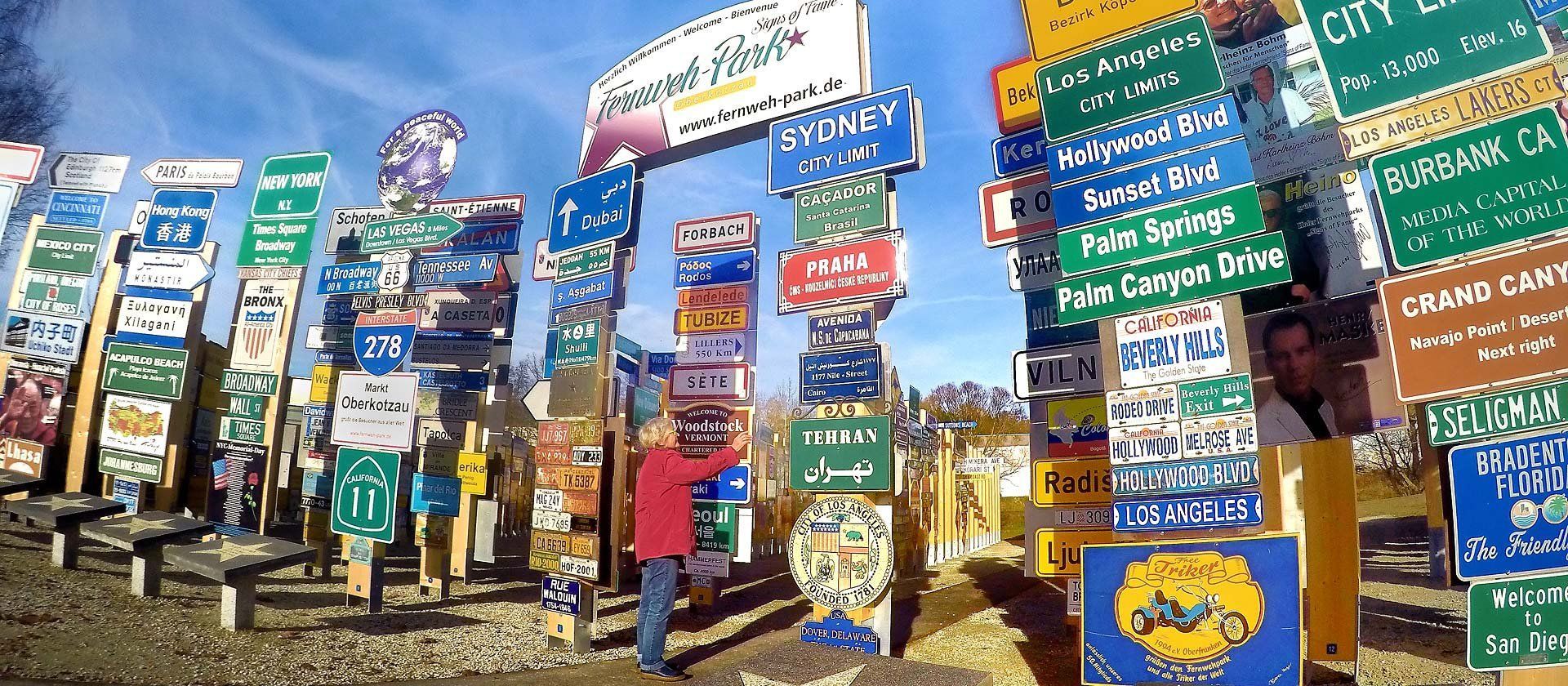 Im Fernweh-Park wird die Geografie außer Kraft gesetzt. New York liegt direkt neben Reit im Winkl, von Rio bis Dubai sind es nur wenige Fußschritte, "Kangaroos next 10 km" warnen Verkehrsschilder und die legendäre Route 66 startet gleich hinter Hamburg. Beim Bummel durch den Fernweh-Park erlebt der Besucher ein Wechselbad exotischer Gefühle. Man geht auf Zeitreise. Denn mit Blick auf die exotischen Städtenamen aus aller Welt kann man, so Initiator Klaus Beer, optisch, gedanklich und emotional, sozusagen im Kopfkino, eine Reise um die Welt antreten – und das und das in wenigen Schritten. Und man verspürt Feeling HOLLYWOOD, hautnah. Denn: