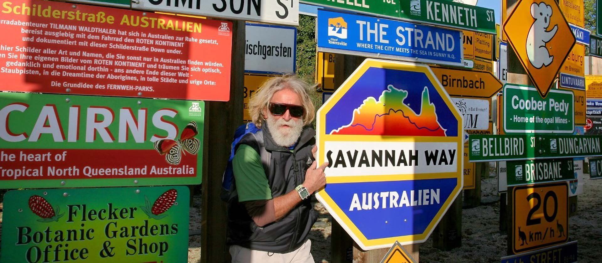 Neben einer Schilderfront mit Ortsschildern aus der ganzen Welt ist der Fernweh-Park sternförmig angelegt. Neben den Themen-Schilderstraßen Europa, USA, Afrika, Asien und Neuseeland kann man sich natürlich auch nach Australien wegträumen. Hier grüßt die "Schilderstraße Australia", die zum größten Teil bestückt wurde von dem bekannten Fahrradabenteurer Tilmmann Waldthaler. Dieser hat mit dem Fahrrad bereits zweimal die Welt umrundet und hat sich jetzt, mit.... Jahren, in Australien "zur Ruhe" gesetzt. Doch diese Bezeichnung gilt nicht für ihn, der zeitlebens mit dem Fahrrad die Welt bereist hat. Tilmann Waldthaler hat sich nun den roten Kontinent "vorgenommen" und sucht immer wieder neue Routen, um seinen Heimatkontinent ausgiebig zu beradeln. Hier etwas von Dir schreiben...