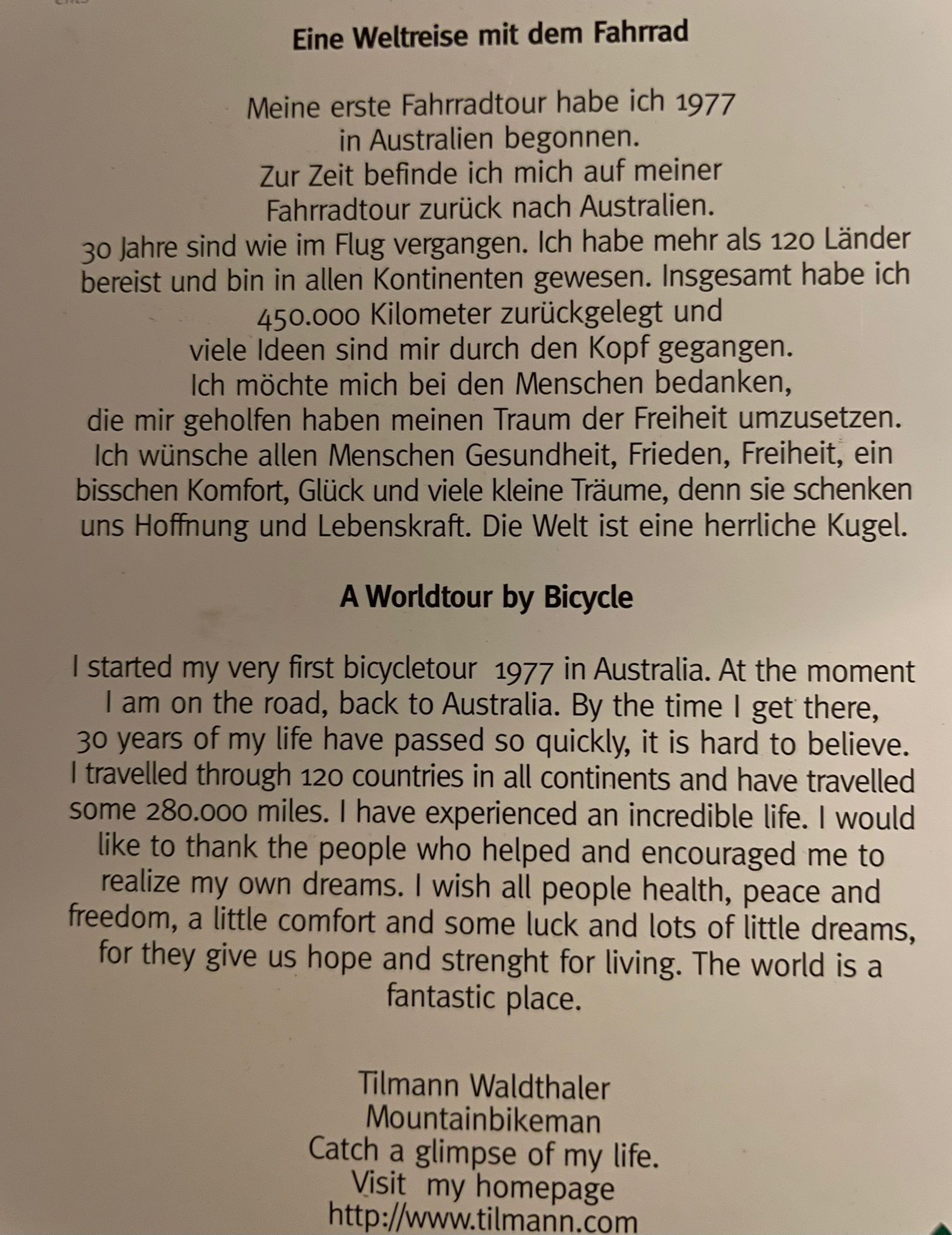 Ich möchte mich bei den Menschen bedanken, die mir geholfen haben meinen Traum der Freiheit umzusetzen. Ich wünsche allen Menschen Gesundheit, Frieden, Freiheit, ein bisschen Komfort, Glück und viele kleine Träume, denn sie schenken uns Hoffnung und Lebenskraft. Die Welt ist eine herrliche Kugel.