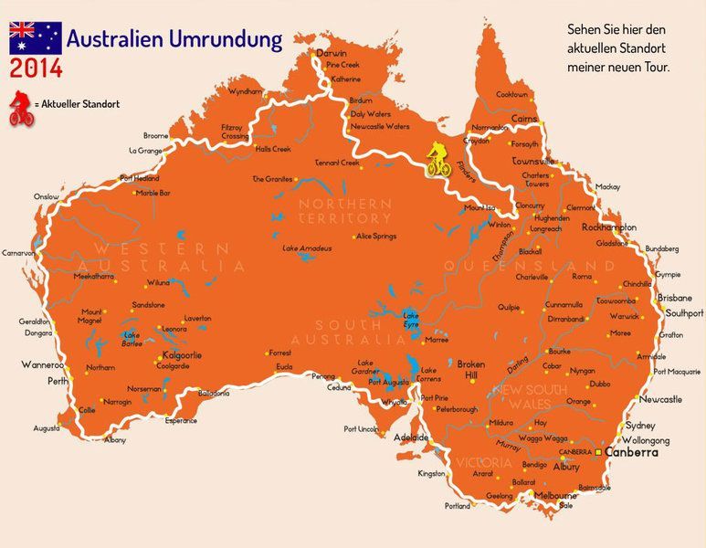 Das neue Lonely Planet Australia Handbuch ist zwar ein Wälzer mit 1.104 Seiten, doch auf einer Tour rund um Australien möchte ich nicht darauf verzichten. Abends im Zelt oder auf dem Campingplatz im Buch lesen und den nächsten Tag planen, ist eine nette und äußerst praktische Sache. Ich bin zwar auch mit Notebook und Iphone ausgerüstet. Aus Erfahrung weiss ich dass es in Australien noch viele Plätze ohne Internetdienst gibt. Sehr viele Gegenden sind einfach zu weit weg von der Realität, oder die Ortschaften sind zu klein um ans Netz angeschlossen zu werden. Bei derartigen Fällen ist ein Buch sehr praktisch. Ganz wichtig, man kann es auch jemandem anderen in die Hand drücken, um schnell etwas ausfindig zu machen. Digitales Zeitalter hin oder her, Bücher haben für mich immer noch einen großen Stellenwert. Übrigens habe ich den Wälzer in England bei Book Depository im Netz bestellt und 28,00 Dollar inklusiv Porto bezahlt. Zehn Tage später war das Buch in Australien. Hier in Australien kostet der Wälzer 51,00 Dollar, also schon mal 22,00 Dollar gespart, das Internet macht’s möglich. Ab dem 13. Juli werde ich unterwegs sein. Das Rad und meine Ausrüstung stehen bereit. Die ersten Wochen werde ich nicht viel Wasser und Essen mitschleppen müssen, die Distanzen zwischen den Ortschaften bis nach Mt. Isa sind ohne große Vorräte zu bewältigen. In Mt. Isa werde ich die Wasserrationen und das Essen für mehrere Tage einpacken. Die Distanzen zwischen den Ortschaften liegen in einigen Fällen bei 270 Kilometern. Ich werde jedoch während der gesamten Reise keinen Anhänger mitnehmen, denn die Strecken im Northern Territory und in Westaustralien verlaufen auf befestigten und gut ausgebauten Straßen.